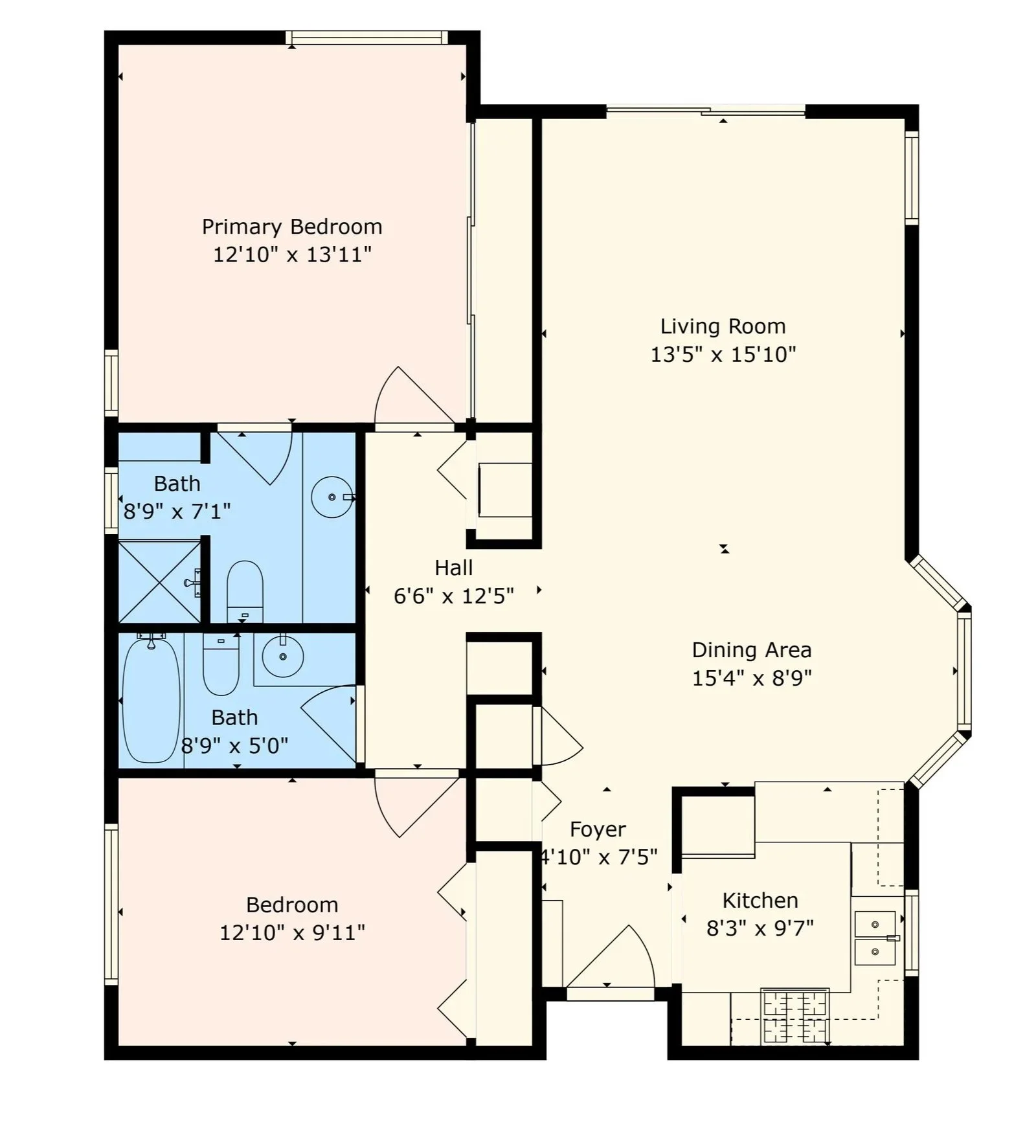 Floor plan of a house showing a primary bedroom, two bathrooms, a living room, a dining area, a kitchen, an additional bedroom, a hall, and a foyer.